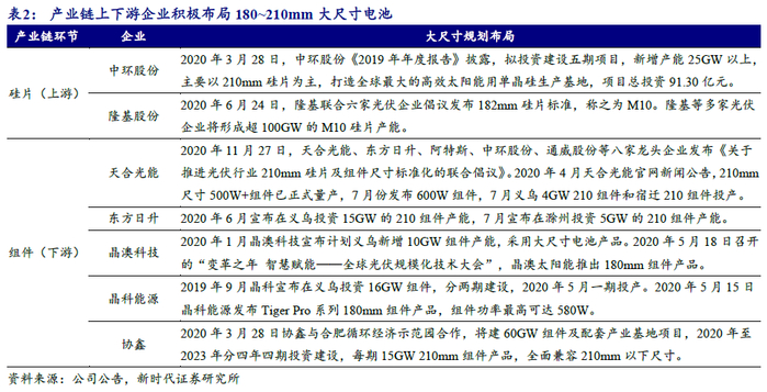产业链上下游积极布局大尺寸,充分发挥协同效应。2020年6月24日,隆基联合六家光伏企业倡议发布182mm硅片标准,隆基等多家光伏企业将形成超100GW的M10硅片产能。2020年11月27日,天合光能、东方日升、阿特斯、中环股份、通威股份等八家龙头企业发布《关于推进光伏行业210mm硅片及组件尺寸标准化的联合倡议》。主流厂商通过硅片、组件尺寸等的标准化,产业链可以实现最好的规模化效应,强有力的帮助上下游企业提高生产效率,优化供给,快速推进行业技术创新,降低产业链制造、光伏系统初始投资和光伏发电度电成本,实现全面平价。
