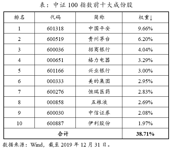 就成份股而言,在中证100指数的100只成份股中,既包含沪市大盘代表的中国平安、贵州茅台、招商银行等企业,又包含深市蓝筹的格力、美的等行业龙头,可以说中证100指数是A股核心蓝筹股的集中地,因而适合进行价值投资、长期配置的机构投资者。前十大成份股占比合计为39%,如下表所示。