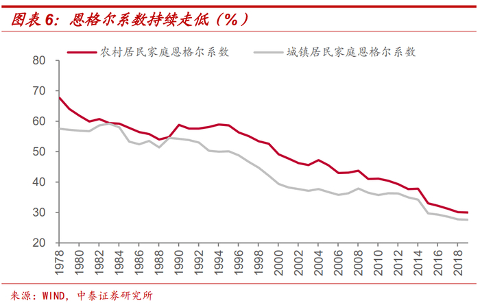 什么是CPI基期轮换?从2001年开始,我国CPI采用国际通用做法,编制定基价格指数序列,将对比基期固定在2000年。之后按照“每年一小调,五年一大调”的原则,每五年进行一次基期轮换,从而准确反映居民消费结构的新变化和物价的实际变动。从历史上三次基期轮换看,食品项权重逐渐下调,服务项权重不断上升。这也符合我国居民消费结构的变化,随着恩格尔系数的不断下降,食品消费占比越来越低,同时在消费升级背景下,服务消费占比逐渐上升。特别是受住房价格上涨和人口老龄化现象加重的影响,居住和医疗消费占比上升较快。