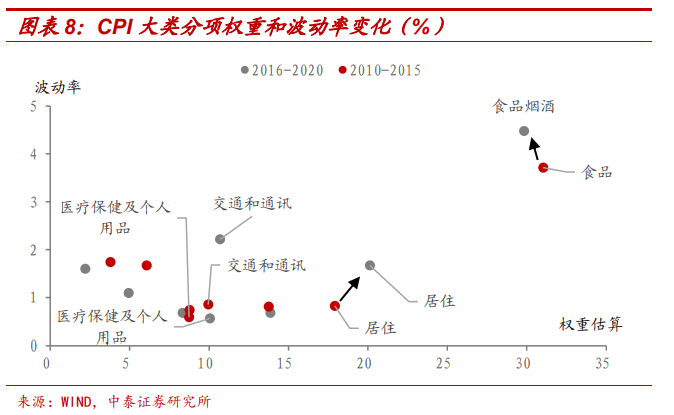 从2011-2015和2016-2020这两个基期CPI大类分项的权重和波动情况看,食品项尽管权重一再调低,但其权重和波动率远超其他分项,始终是影响CPI走势的首要因素;其次是居住项,虽然权重和波动率逐渐上升,但对CPI的影响程度远小于食品项;其他六个分项权重和波动率较低,影响作用有限。