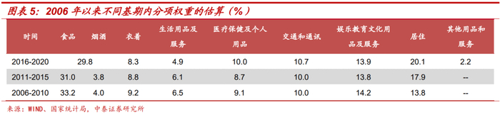 综合上述方法,我们估算了2006年至今CPI八大类分项的权重变化,如下表所示。