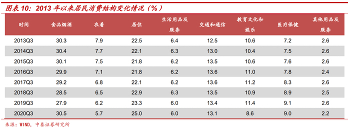 2016-2019年间,食品烟酒消费占比下降幅度较大,从2015Q3的30.13%降至2019Q3的27.87%;同时居住项和医疗保健项占比持续走高,居住项从2015Q3的21.80%升至2019Q3的23.33%,医疗保健项从7.62%升至9.14%;其他各项变化并不明显。不过2020年食品项消费显著回升至30.47%,衣着、教育文化和娱乐占比则明显下滑,主要是受到疫情冲击影响,教育文娱、交通通信和服装相关消费需求受到明显压制,同时食品消费占比被动提升。考虑到疫情主要是短期冲击,并不会逆转2015年以来居民消费结构的变化趋势。我们预计统计局做新一轮基期轮换时,很可能继续下调食品项权重,同时上调居住项和医疗保健项权重。