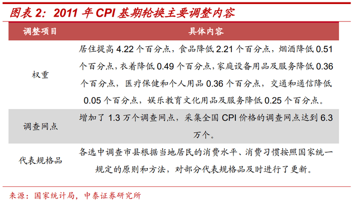 2011年:主要调整居住项和食品项权重。具体包括:上调居住项权重4.22个百分点,下调食品项权重2.21个百分点,其他分项小幅微调,同时增加调查网点数量,调整了部分代表规格品。