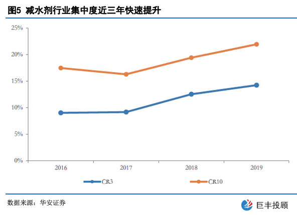 行业集中度的提升带来的议价能力提升。随着龙头企业的规模不断扩大和中小企业的出清,最终将形成类似水泥行业的区域寡头格局,减水剂企业将拥有较强的定价能力;与此同时,下游包括商混站在内的主要客户集中度也在不断提升,而直销渠道的工程类大客户对减水剂也在逐渐采用集采模式,行业B端属性越来越强将带来产品定价的规范化,对于龙头企业来说实质上增强了议价能力并提升了产业链地位。