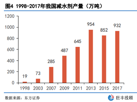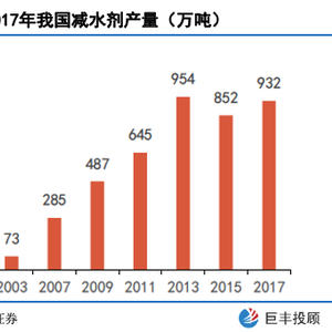 根据混凝土外加剂分会数据,2017年减水剂产量932万吨,占整体混凝土外加剂比例达66.6%。若按2017年减水剂占外加剂比例进行测算,预计目前减水剂市场规模约350亿。其他功能性外加剂占比有缓慢提升趋势,根据《我国混凝土外加剂行业最新研发进展和市场动态》,其他功能性外加剂产量占比从2011年27.8%提升至2017年33.4%。