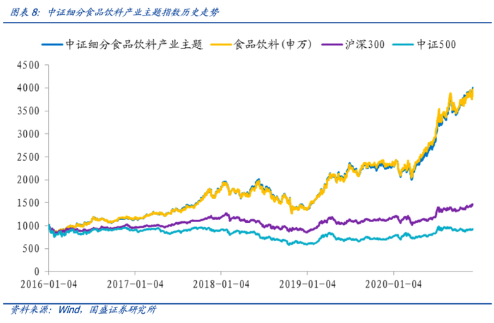 从历史表现来看,中证细分食品饮料产业指数长期具有稳健的超额收益,近年超额收益爆发式增长。指数基日为2004年12月31日,近5年以来自2016年1月1日至2020年12月04日涨幅达到300.78%且每年跑赢沪深300和中证500,同期沪深300和中证500涨幅为46.03%和-7.43%,指数表现远超宽基指数。指数走势与传统食品饮料行业指数趋同,走势基本一致。