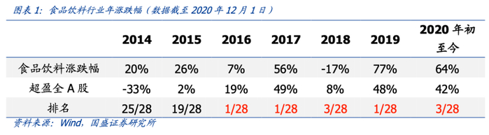 食品饮料行业兼具了可选板块的“进攻性”和必选板块的“避险性”,在中国第三产业崛起的洪流中,食品饮料板块作为消费品的组成部分之一,演绎了近五年冠绝 A 股的行情。经历了2013-2014年的调整期之后,食品饮料行业指数(以申万行业分类为标准)多年领跑28个申万一级行业。