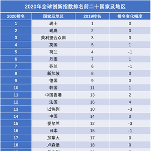 南方财经全媒体记者梳理发现,与2019年相比,2020年全球创新指数榜单前二十的国家中共有3个国家实现排名上升,包括英国、丹麦和韩国,分别上升1位,有2个国家排名下滑,分别是荷兰和芬兰,均下降1位,其余国家排名维持不变,前二十排名整体变化幅度较小。