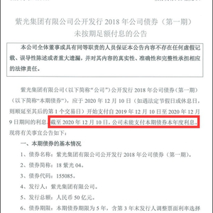 12月10日晚间,紫光集团发布公告,因该公司流动资金紧张,未能按照约定筹措“18紫光04”债券足额兑付付息资金,无法按期足额兑付付息。