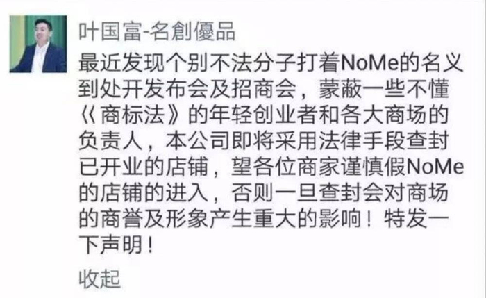 2018年,叶国富发朋友圈指责不法分子打着NoMe旗号进行加盟招商。
