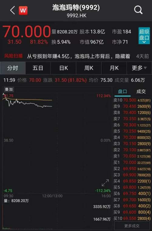 12月11日,“盲盒第一股”泡泡玛特正式在港交所上市,公司股价开盘价为77.1港元,较发行价涨超100%。截至午间收盘,泡泡玛特股价报70港元,上涨81.82%,市值为967亿港元(约合人民币816亿元)。