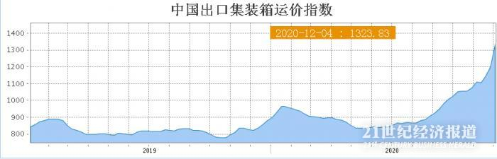 与此相伴的是运价的狂飙。上海航交所发布的中国出口集装箱运价指数从5月份的低于850点,一路飙涨到12月4日的1323.83点;上海出口集装箱运价指数更是从1月的996点涨至12月4日的2129.26点,两者不断刷新历史新高。