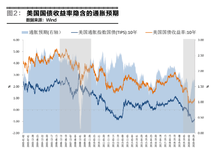 三是通胀预期回升不足,实际利率落入负值区间。美国通胀保值国债(TIPS)收益率可视为相应期限美债的实际收益率,因此,美债10年期名义利率与TIPS收益率之差常作为市场的通胀预期指标。