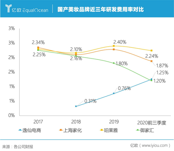CBNData消费站通过对比国产美妆上市公司的财报数据,的确发现完美日记的研发费用占比在逐年提升,赶超珀莱雅、上海家化等指日可待。但是,对于这个号称要成为中国“欧莱雅”的美妆公司,在研发方面还与后者存在很大差距。而这个差距,不光是完美日记,也是绝大多数国产美妆企业的弱点所在。