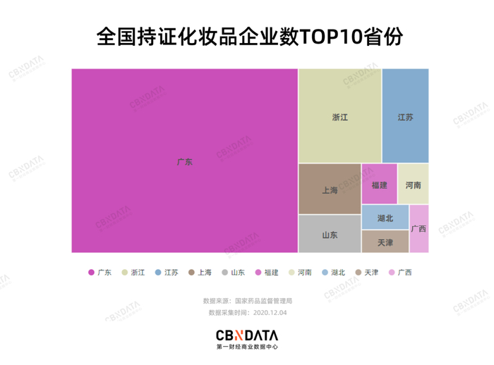 根据国家药品监督管理局数据,截至2020年12月4日,全国共有5399家化妆品生产许可获证企业。而这其中,广东企业有2958家,占比高达54.8%,是第二名浙江的5倍多。广州市的化妆品企业数量,则占到全广东省的67.2%。“中国化妆品业看广州”,这句slogan是真不为过。