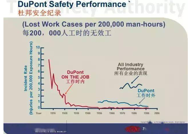 在一次次血的教训和老杜邦传承下来的人文思想中,杜邦历任领导费尽心思推出了一系列严格有效的措施,此后逐渐形成了杜邦的“十大安全原则”。而该原则是否真正起到了应有的作用,我们用几组安全业绩来说明: