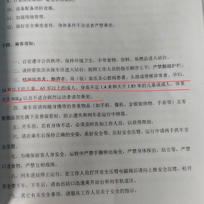 李志轩举例,以某款过山车(滑行车类游乐设施)的产品说明书为例,在第十四条乘客说明中,除了对乘坐者身高及身体状况有明确限制外,还标注了65周岁以上老人请勿乘坐。