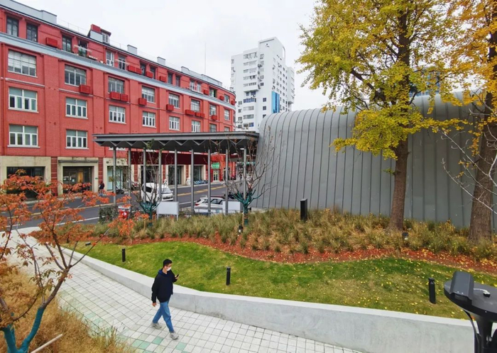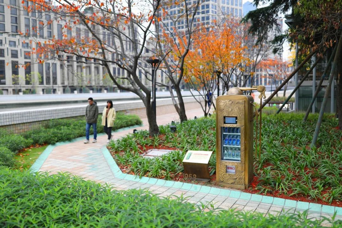再往西走,河滨大楼矗立眼前。楼前绿化虽有施工围挡,但“颜值”已初显。地面井盖上,外白渡桥、上海大厦等“明星元素”也很吸睛。