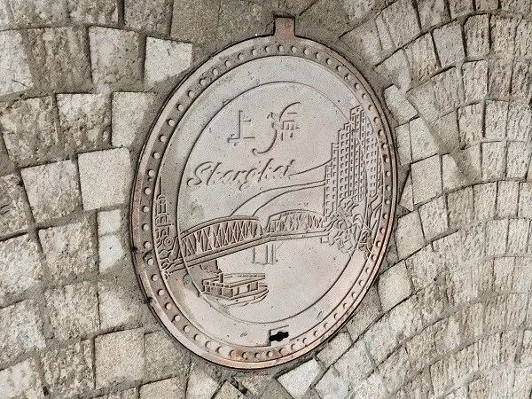 邮政大厦前的井盖上,有外白渡桥、上海大厦等元素