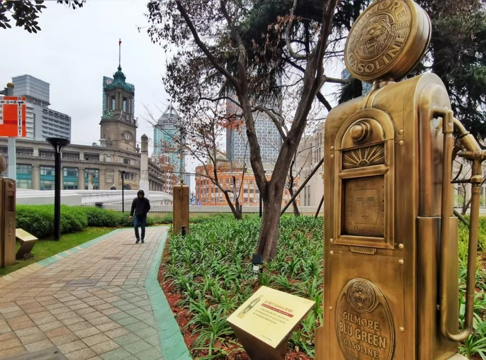 往西不远,便是中国第一座加油站,从头顶拉下的油枪与几座加油机雕塑,令人眼前一亮。