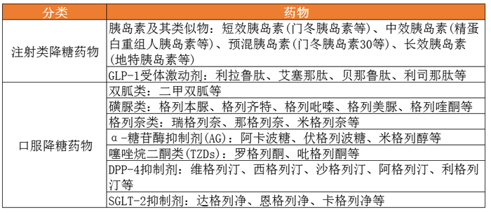 目前的糖尿病治疗药物主要有口服降糖药物和注射类降糖药物两大类,口服降糖药物里又分为双胍类、磺脲类、格列奈类、α-糖苷酶抑制剂(AGI)、噻唑烷二酮类(TZDs)、二肽基肽酶IV(DPP-4)抑制剂、钠-葡萄糖协同转运蛋白2(SGLT-2)抑制剂等;注射类降糖药物分为胰岛素及其类似物、胰高血糖素样肽1(GLP-1)受体激动剂等。