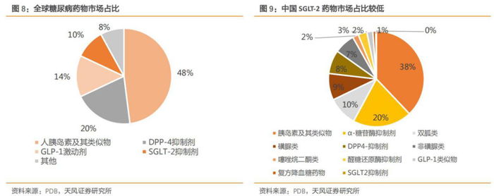 天风证券指出,在口服降糖药中,DPP-4抑制剂、SGLT-2抑制剂等新型降糖药都被指南所推荐,并可作为二联治疗用在疾病进程偏前端的位置。