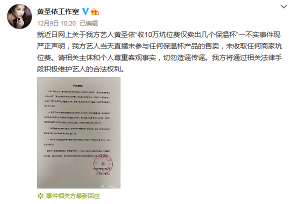 近日,有直播代运营商爆料称黄圣依直播带货“收取10万坑位费,仅卖出5个保温杯”,而且迟到一小时,直播期间基本不碰产品等相关言论。12月9日,黄圣依工作室发表声明否认相关言论。声明中称,直播活动期间,黄圣依未参与任何保温杯产品售卖,也未收取任何商家的坑位费,根本不存在保底退款一事。