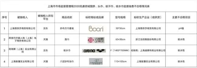上海市市场监督管理局对天猫,京东,百联3个网络平台销售的20批次围脖、头巾、吸汗巾、吸水巾进行监督抽查,共抽检出4批次不合格产品,不合格检出率为20%。