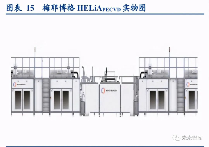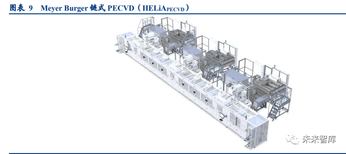 盒中盒式 S-Cube 等离子体反应器,钝化效果优:梅耶伯格是老牌光伏设备供应商,持续多年的研发投入和技术跟 进使其在 PECVD 领域保持着较强的技术领先性。梅耶伯格针对 HJT 开发了 HELiAPECVD 型号 PECVD 设备,采用盒 中盒式 S-Cube 离子体平行板反应器,利用 13.56MHz 射频源最小化等离子体在沉积过程中对薄膜造成的损伤,以获 得较高的钝化质量。硅片少数载流子的寿命决定了钝化质量,梅耶伯格的 PECVD 设备沉积后可实现区熔单晶硅片 (FZ)少子寿命超过 10ms,直拉硅片(CZ)少子寿命超过 4ms,制造出的电池片温度系数最优可达-0.25%/K。