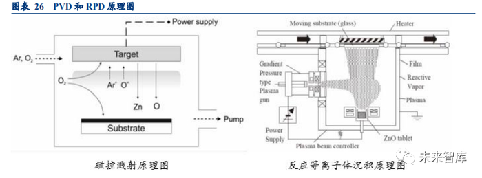 HIT 表面的 TCO 薄膜的作用为收集光生载流子并将其输送到金属电极上,导电性好、透过率高是 TCO 薄膜需要具 备的关键特性。在工艺方面,目前主要采用 PVD(磁控溅射)和 RPD(反应等离子体沉积法)两种方式,PVD 利用 经过加速的高能粒子轰击靶材,使靶材表面的原子脱离晶格逸出沉积在衬底表面发生反应而形成薄膜;RPD 法利用 等离子体枪产生氩等离子体,氩等离子体进入生长腔后,在磁场作用下轰击靶材,靶材升华形成蒸气实现薄膜沉积。