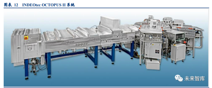 Mirror 技术缩短工艺周期,ACCT 保证成膜质量:INDEOtec 成立于 2007 年,是一家专注于薄膜太阳能电池 PECVD 工艺设备研发、生产和销售的瑞士设备生产商。公司已开发出专用于 HJT 非晶硅薄膜沉积的 OCTOPUS 系列设备, 采用 Mirror 核心技术,可在无需破坏真空且无需翻转基板情况下完成基板双面的沉积,可降低工艺周期,提升产能。此外,公司还采用 ACCT(抗交叉污染处理)特殊技术,避免前一沉积过程中残留在腔壁或电极上的反应物污染下 一沉积过程,保障了多层薄膜的沉积质量。目前应用该设备的 6 英寸的直拉硅片(CZ)上少子寿命可达 5ms,4 英寸的 区熔硅片(FZ)上少子寿命达 10ms。
