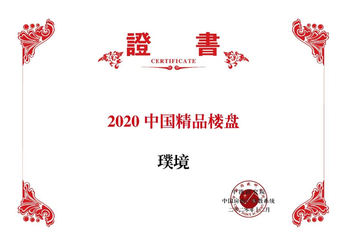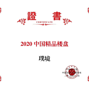 2020年12月3日,由中国房地产指数系统、中国物业服务价格指数系统主办,中指控股(CIH)、中指研究院承办的“2020中国房地产大数据年会暨2021中国房地产趋势报告会”,在北京粤财JW万豪酒店盛大举行。会上,璞境荣获“2020中国精品楼盘”殊荣。