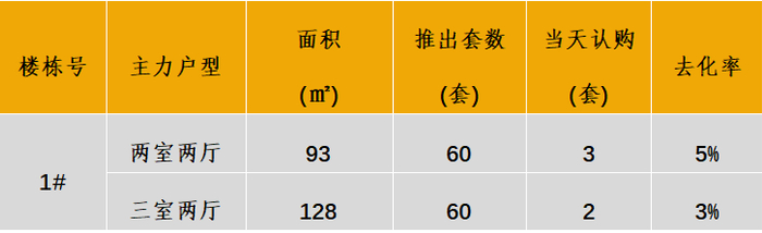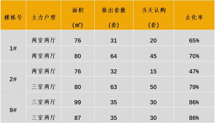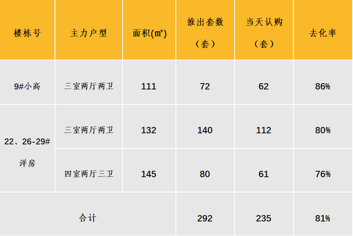 认购去化:推出292套毛坯房源,开盘当天认购235套,去化率81%。
