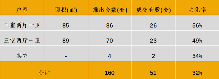 认购去化:推出160套精装房源,开盘当天认购51套,去化率32%。