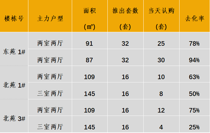 认购去化:推出144套精装房源,开盘当天认购130套,去化率90%。