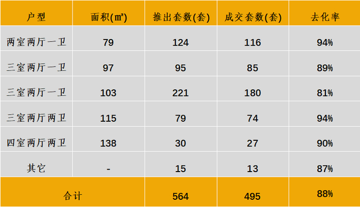 认购去化:推出564套精装房源,开盘当天认购495套,去化率88%。