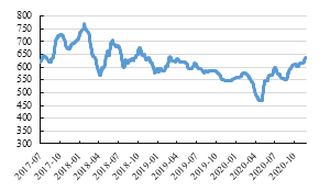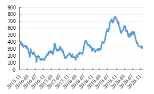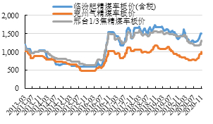焦炭焦煤板块:焦炭方面,截至12月11日,汾渭吕梁准一级焦2030元/吨,周环比持平,日照准一级焦2400元/吨,周环比上涨40元/吨。钢厂方面,受益于钢材出货良好及价格回升,高炉开工率仍处于同比高位,对焦炭需求仍有拉动。山西、河南等地已经开始逐步执行去产能要求,后续供应仍将受限。焦企在供需紧张及高利润刺激下,开工负荷持续保持较高水平,但并未累库,短期焦价仍有望保持强势。焦煤方面,截止12月10日,CCI山西低硫指数1482元/吨,周环比持平,月环比上涨45元/吨;CCI山西高硫指数1069元/吨,周环比上涨15元/吨,月环比上涨35元/吨;灵石肥煤指数报980元/吨,周环比持平,月环比持平;CCI临汾蒲县1/3焦煤指数报1120元/吨,周环比持平,月环比上涨120元/吨。限制澳煤进口严重影响国内焦煤尤其是低硫主焦煤的供给,同时蒙煤进口受疫情影响通关受阻,随着影响发酵,叠加下游焦炭开工率高,利润空间大,供给受限煤焦高价差下焦煤价格仍有上行空间。