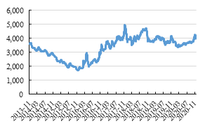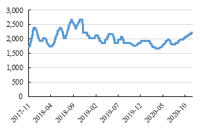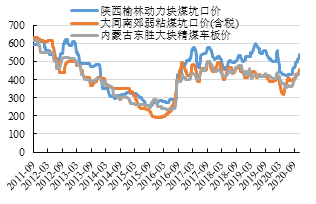 供应平稳,销售良好,产地煤价稳中上涨。截至12月4日,陕西榆林动力块煤(Q6000)坑口价540.0元/吨,周环比上涨10.0元/吨;大同南郊粘煤坑口价(含税)(Q5500)458.0元/吨,周环比上涨12.0元/吨;内蒙古东胜大块精煤车板价(Q5500)440.0元/吨,周环比上涨8.0元/吨。产地供应基本平稳,煤矿销售较好,煤价延续上涨。