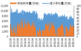 图21:秦皇岛港铁路到车量及港口吞吐量(万吨)