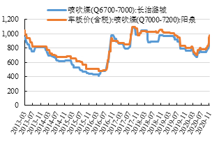 图17:喷吹煤车板价(含税)变动情况(元/吨)
