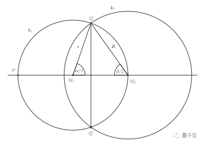 根据Ullisch的思路,他以两个圆的圆心与其中一个交点相连,组成了一个三角形,如下图所示。