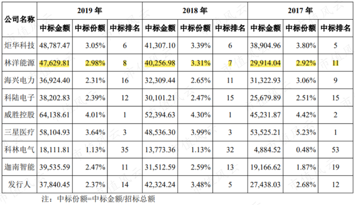 (近三年主要电表上市公司在国家电网智能电表招标的中标情况,表中单位为万元,来源:万胜智能招股说明书)
