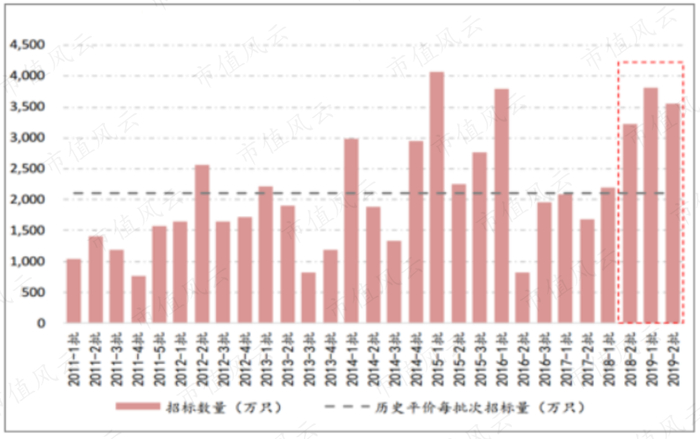 回顾历年国家电网对智能电表的招标数量,2018年下半年起该指标较往年明显有回升。2019年国家电网智能电表招标量约为7380万只,分别是2017年、2018年招标总量的1.95、1.4倍。
