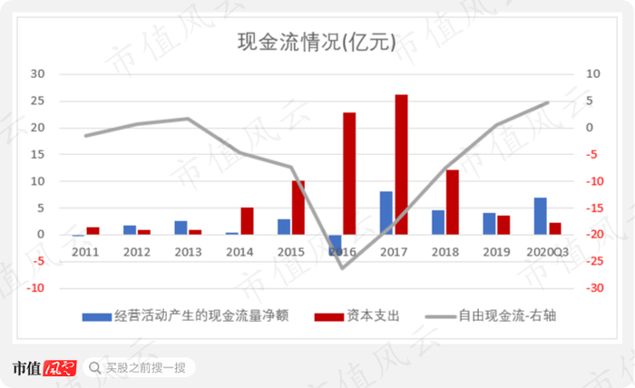 直至2019年起,林洋能源因只新增少量光伏电站资本支出减少、电表业务有所恢复才导致自由现金流重新转正。