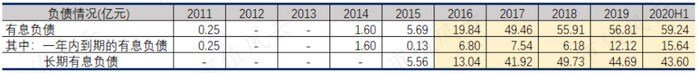 与资本支出同时点同向变动的还有林洋能源的有息负债。2014年起公司的有息负债从1.6亿元开始一路涨至2020年6月末的59.24亿元,其中涨幅最明显的正是2016年林洋能源进入大举筹建光伏电站的期间。