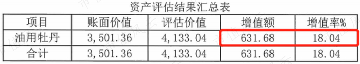 其中,牡丹花多为定植期1~2年植株(收购当年无牡丹花籽产出),评估增值632万元,评估增值率18.04%。