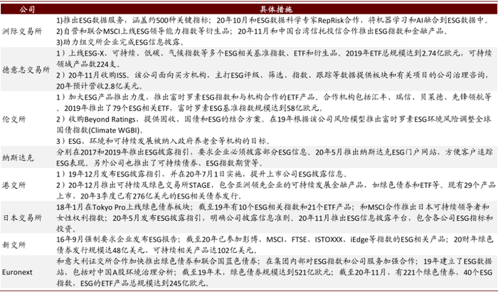 ► 投资新趋势:被动投资占比持续提升、ESG投资兴起。1)被动投资策略的快速增长持续影响着全球资管行业。2019年美国被动投资的权益基金规模首次超过主动管理者权益基金;同时,ETF作为一项受欢迎的低费率被动投资方式,其全球管理规模预计在2025有望达到25万亿美金[3]。被动投资的大浪潮将推动指数业务的快速发展。2)ESG投资的兴起:ESG及气候等因素正成为主流投资的重要考虑因子。2018年初全球可持续投资资产规模达30万亿美金、较2016年初增长34%[4];越来越多的大型上市公司也开始在其年报中披露关于ESG相关章节。投资决策中ESG重要性的提升带动了对于相关指数、数据、分析工具的服务需求。3)多元投资的发展:全球低利率环境下,伴随着金融市场深度与广度的提升、居民财富积累对于多元化资产配置的需求、新的技术发展对于投资行为的影响、以及社会对于环境/气候/公司治理等可持续发展因素越来越多的关注,投资方式和资产越来越多元化。多元投资的强化对于交易所的多资产交易及清算能力,以及多元和另类数据服务提出了更高的要求。
