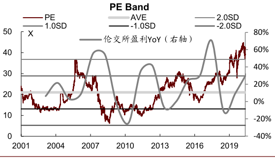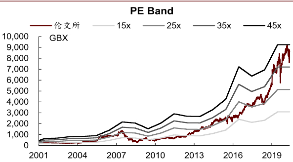 图表: 伦交所估值水平整体主要受盈利增长预期驱动,2016年后因数据、科技业务带来的收入结构优化,估值中枢稳步抬升