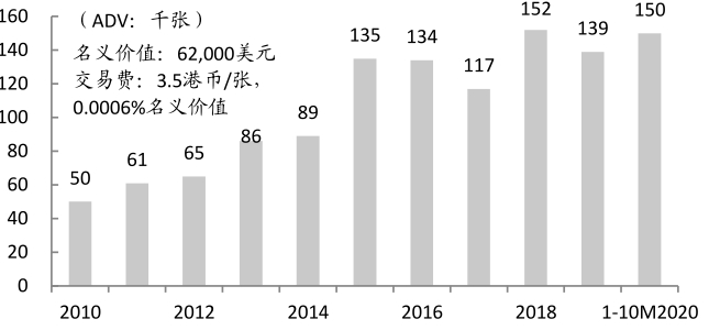 3)流动性的结构性改善:全球比较而言,港股市场的换手率整体偏低。我们判断,上述1)和2)将从市场扩容&上市公司结构改善、投资者增长&投资者结构优化供需两端共同助力市场流动性改善,对于交易量的增厚影响则将是可交易市值及换手率齐增的乘数效应。此外,港股较高的印花税使其现货交易中程式及量化交易占比较低、亦拖累市场换手率。港交所不断提升市场微结构、促进市场价格发现及交易效率,同时衍生市场不设印花税、资本效率较高,程式及量化交易占比较高。