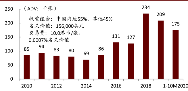 1)以MSCI A股期货为抓手,打造离岸A股衍生品中心。2020年6月以来,无论是境内证监会主席及副主席对于发展离岸风险管理工具的积极表态还是李小加在近期网志中对此“已近水到渠成”的表述,我们判断MSCI A股期货产品的推出或在近期取得积极进展。作为新交所富时A50期货合约的竞品,我们认为港交所MSCI A股期货合约无论在对冲效果还是投资者基础上都将更胜一筹;预计其推出且平稳交易后,产品活跃度将大大优于当前新交所富时A50期货合约的交易情况。